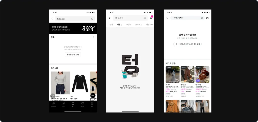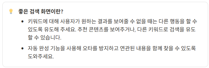 사용자에게 결과를 보여줄 수 없을 때 빈 화면을 어떻게 채울지 고민하기.(추천 혹은 베스트 상품으로 이어지는 행동을 유도하는 것도 방법이다.)