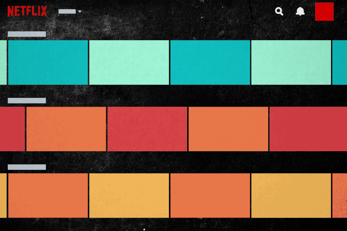 Netflix를 탐색할 때 영화와 TV 프로그램이 장르나 테마에 따라 가로로 그룹화됨. 각 장르나 테마에 따라 썸네일 + 제목의 리스트가 한 방향으로 움직이는 것을 보고 한 그룹이라는 것을 알 수 있음.