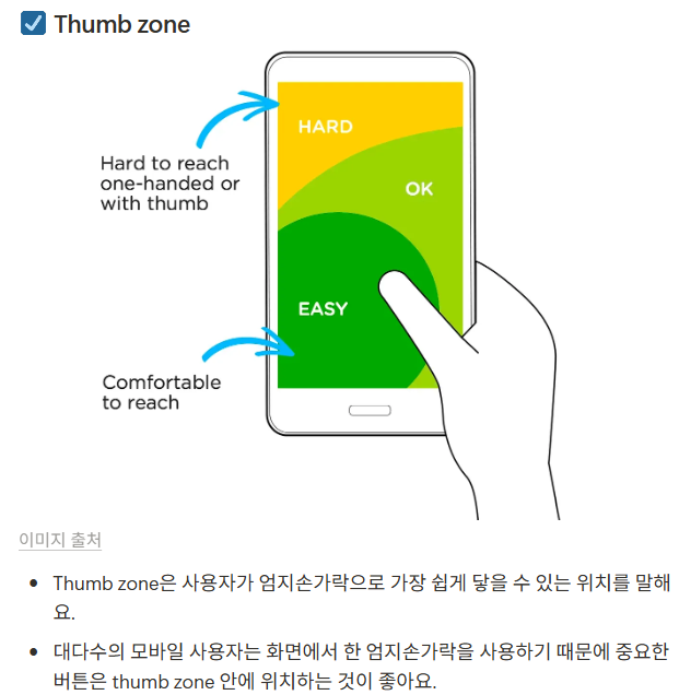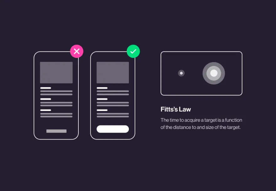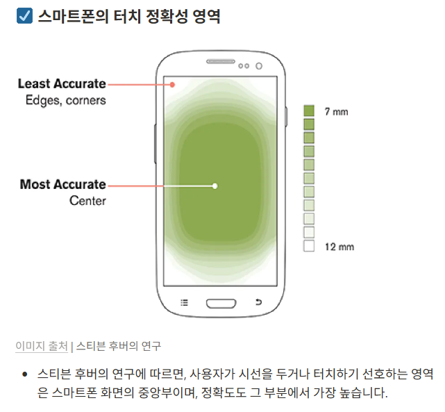터치 대상에 도달하는 시간은 대상까지의 거리와 크기와 함수 관계에 있다는 법칙. 즉 쉽게 말해, 사용자가 인터랙션해야 하는 대상은 거리가 가깝고, 크기가 커야 사용성이 좋다는 뜻.