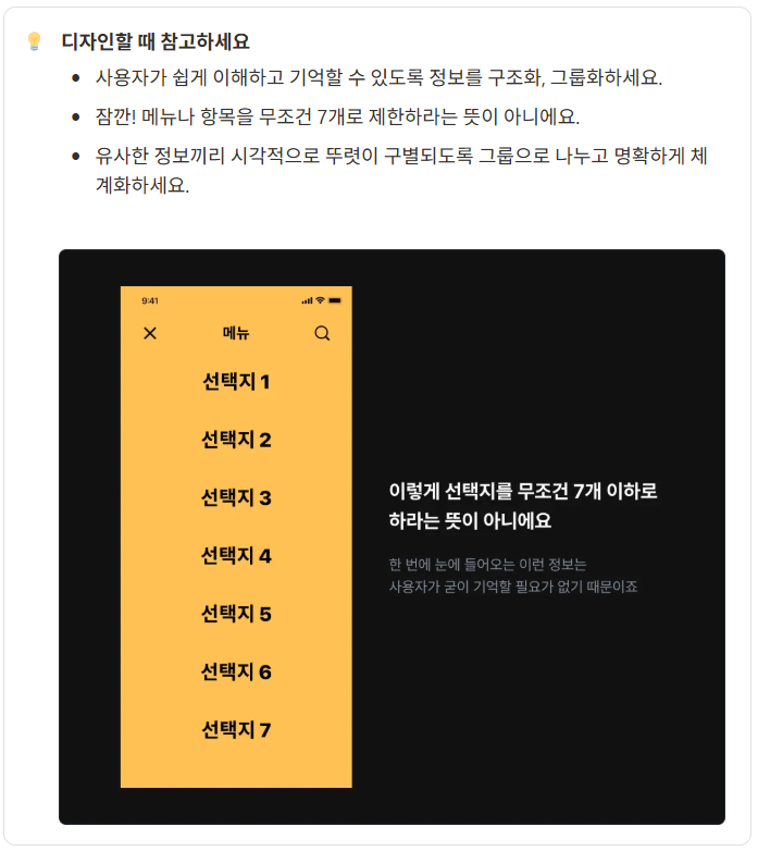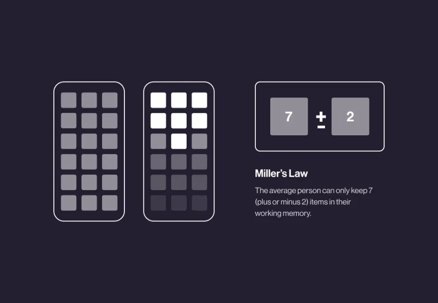 보통 사람은 작업 기억에 7(+-2)개 정도의 항목밖에 저장하지 못한다는 법칙.