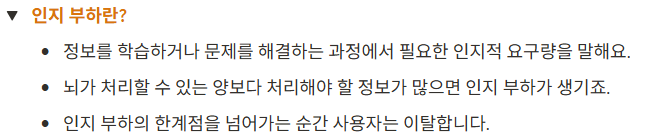 사람의 뇌에 한꺼번에 복잡하고 많은 양의 정보가 들어오면 이를 처리하기 위해 인지 부하가 생김.