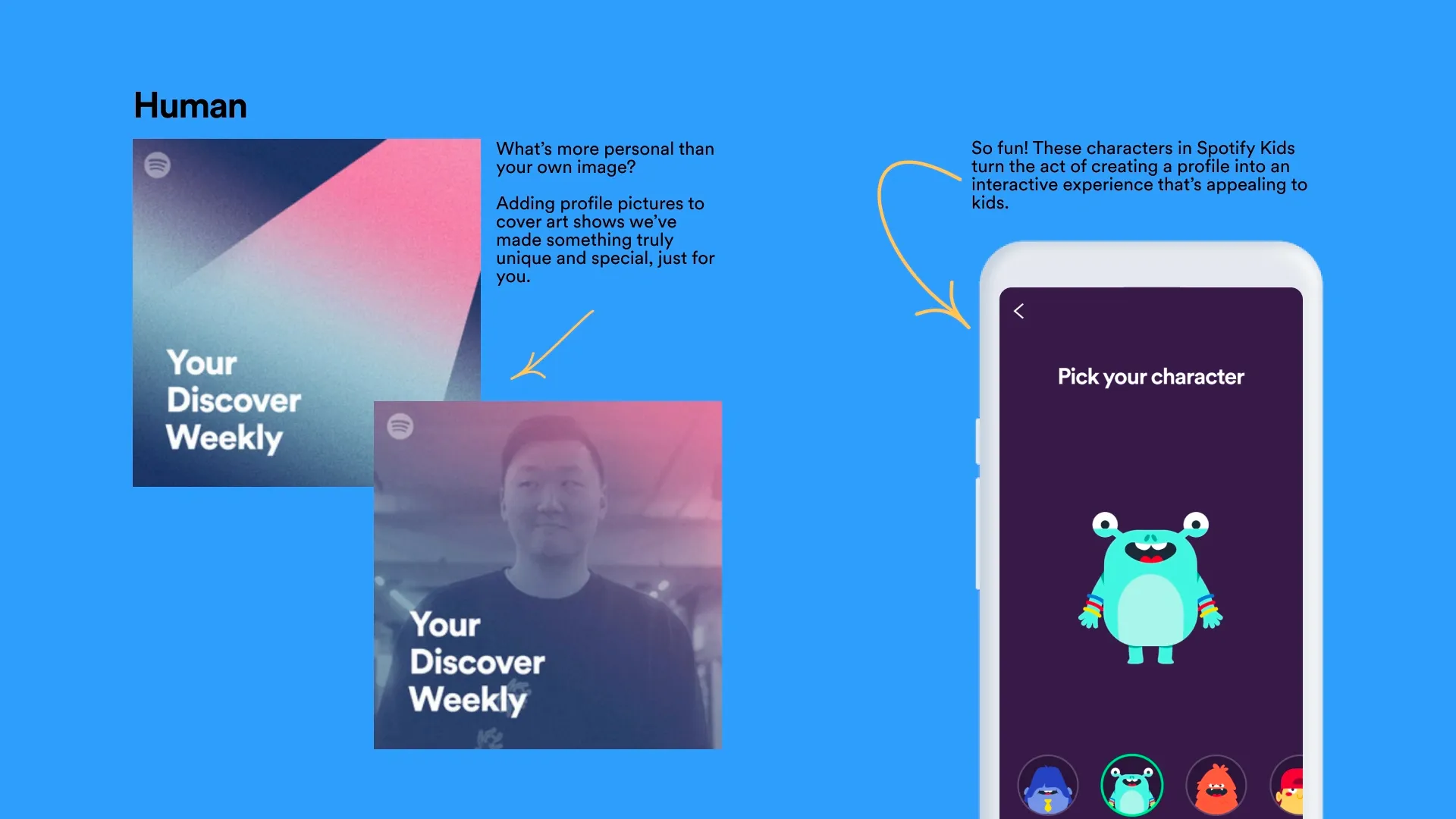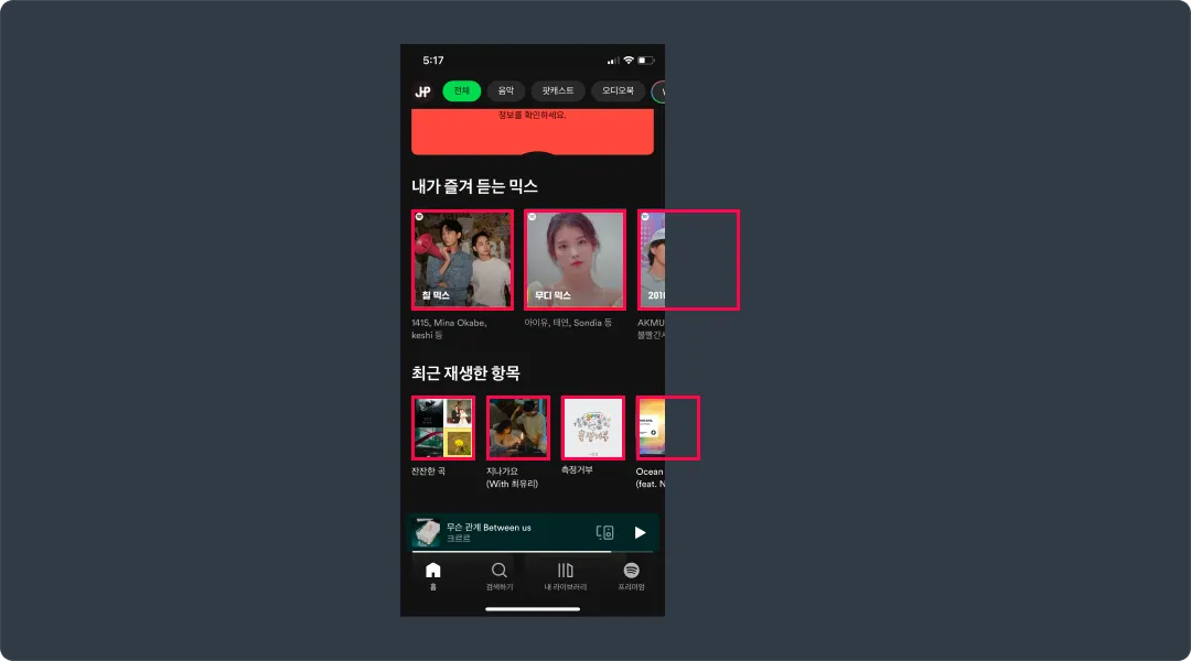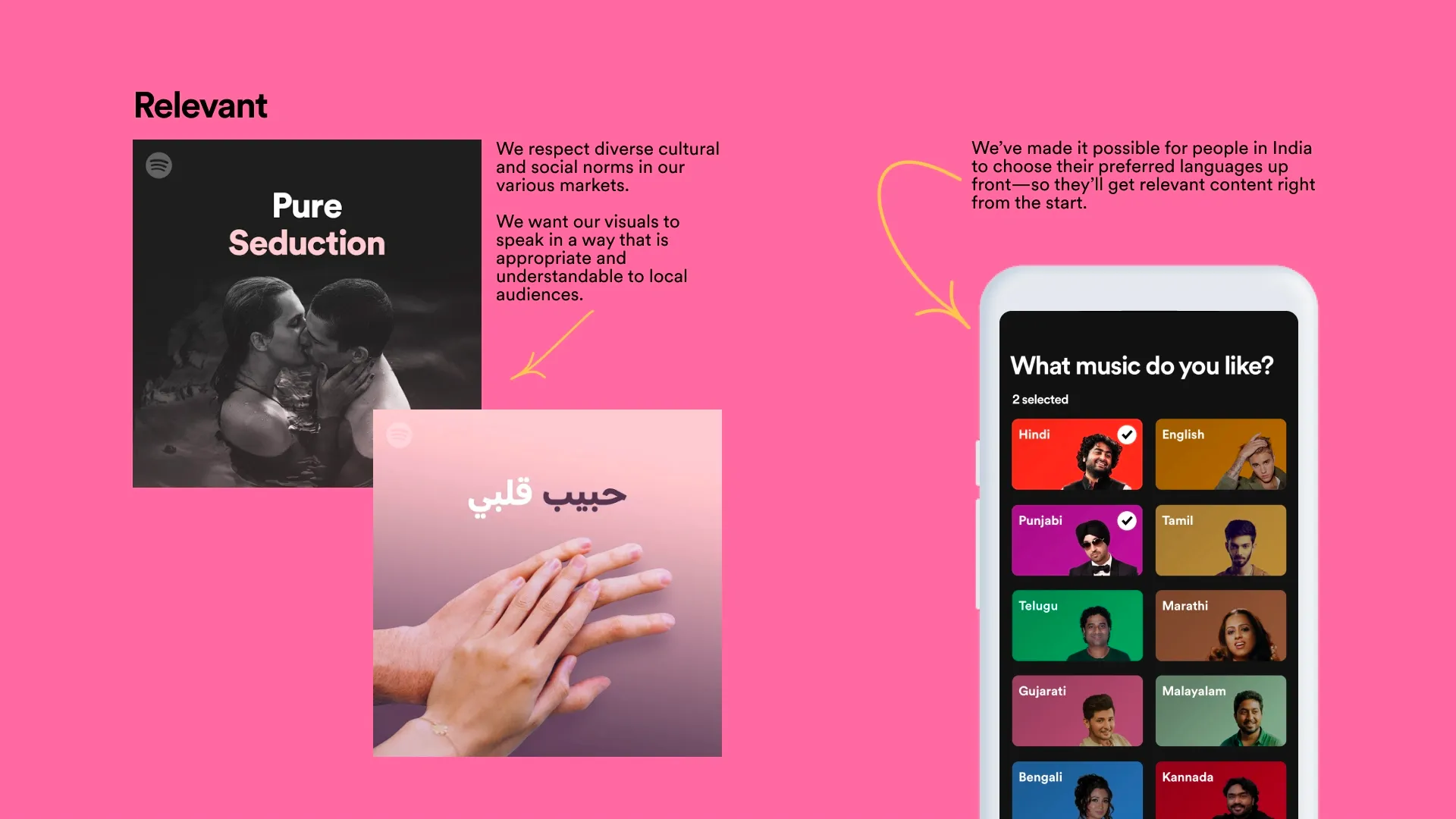 스포티파이는 개인화를 통해 사용자 개인을 위해 만들어진 것이라는 느낌을 주어야 한다. 이를 위해 정보를 적시에 제공하는 것이 중요하다. 예를 들어 재생 목록의 커버 이미지를 보여줄 때 문화권에 맞춘 정보를 제공한다.