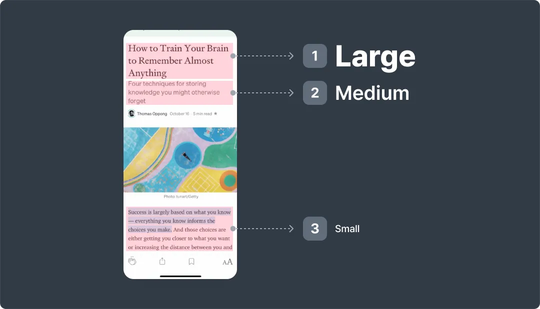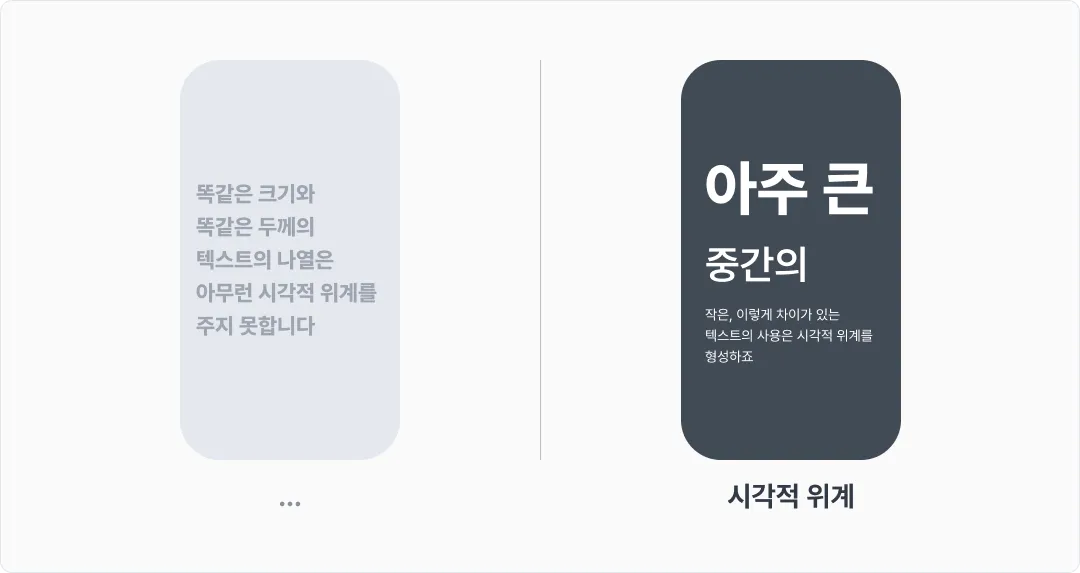 명확한 시각적 위계를 만들기 위해서는 2~3개 정도의 텍스트 크기를 사용.