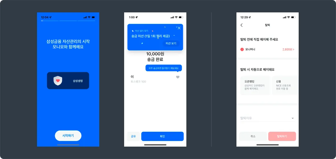 사례(모니모)는 하기와 같다. 탈퇴는 돌이킬 수 없는 기능이기 때문에 제품에서 사용하지 않는 전혀 반대의 색상을 사용해 강조하고 있다.