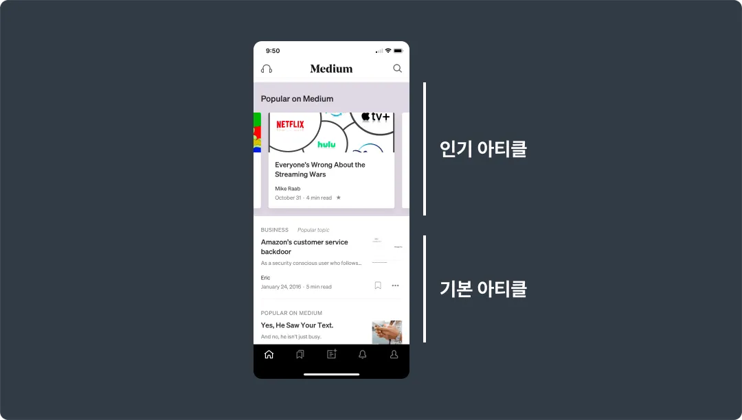 사례(미디엄)는 하기와 같다. 인기 있는 아티클을 다른 아티클과 구분되는 크기로 훨씬 키워 상단에 배치.
