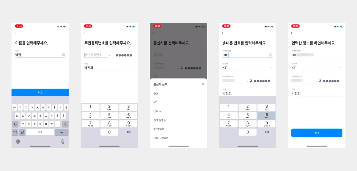 회원가입에 필요한 정보를 한 번에 노출하고 입력을 받을 수도 있지만 입력 폼을 단계적으로 노출하여 사용자의 부하를 낮춘다.