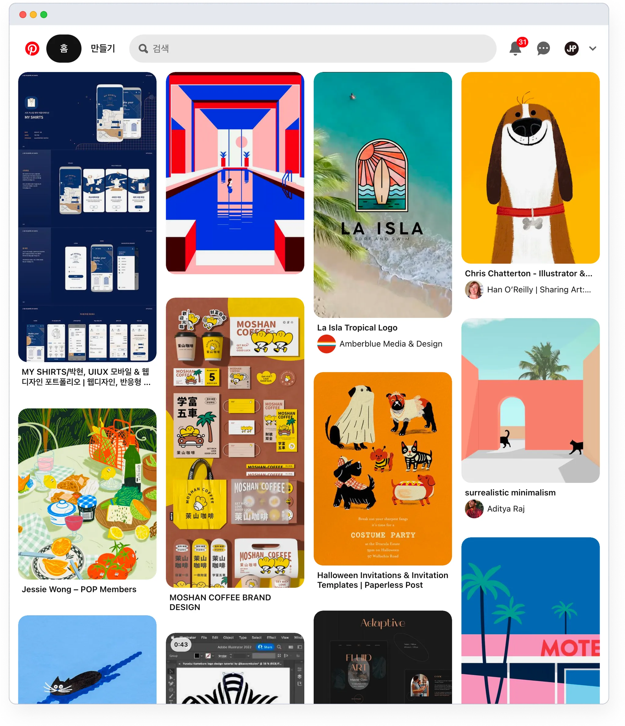 핀터레스트 홈 화면의 이미지는 크기가 모두 다르지만, 수직선을 만드는 열로 배열되어 있음. 여기서 연속된 세로의 수직 레이아웃으로 인해 사용자는 편안함을 느낌. 더불어 사용자가 앱을 위아래로 스크롤 하도록 유도하는 역할도 힘.