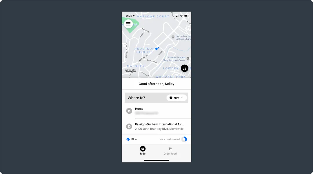 우버 같은 경우 지도와 화면 하단이 절반으로 분할되어 사용자에게 똑같이 중요하다는 생각이 들게 한다. 대신 회색 배경 때문에 시선은 즉시 'Where to?'에 끌린다. 이후 다시 글씨 크기가 약간 작은 그 아래의 최근 위치로 이동한다.