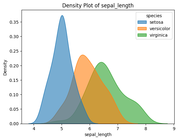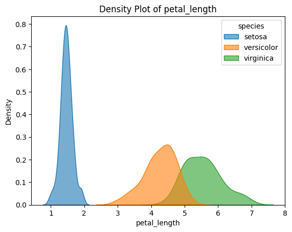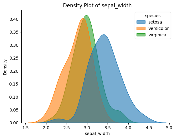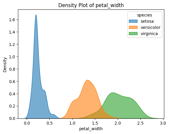 sns.kdeplot(data = iris, x=feature, hue='species', fill=True, alpha=0.6)