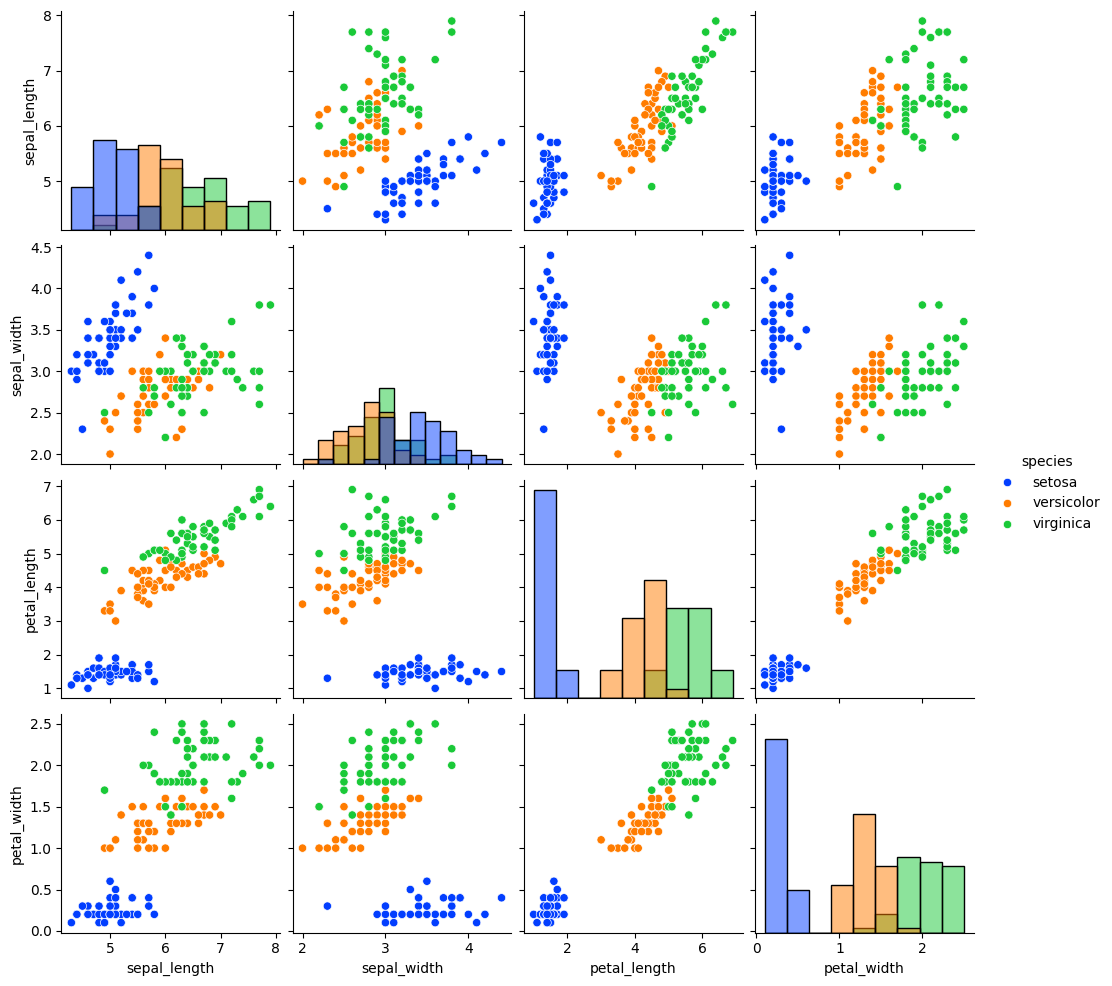 sns.pairplot(iris, hue='species', diag_kind='hist', palette='bright')