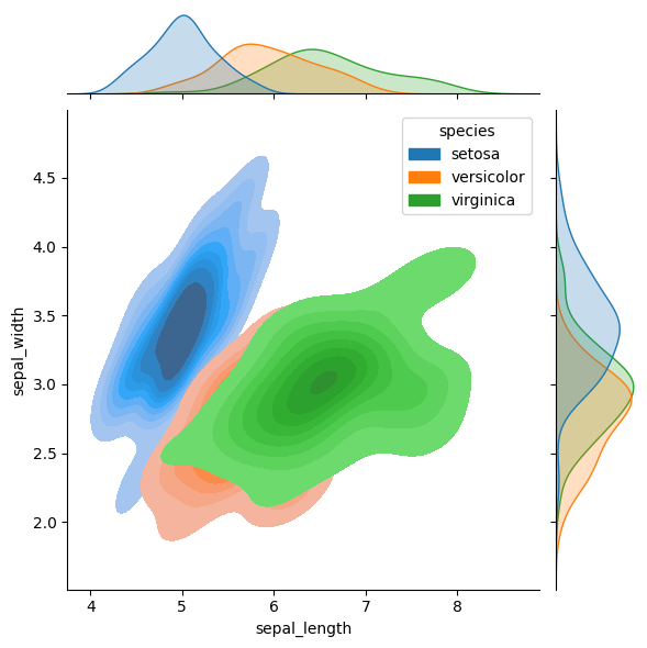 sns.jointplot(data = iris, x='sepal_length', y='sepal_width', hue='species', kind='kde', fill=True)