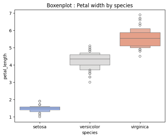 sns.boxenplot(data = iris, x='species', y='petal_length', palette='coolwarm')