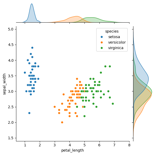 sns.jointplot(data = iris, x='petal_length', y='sepal_width', hue='species', kind='scatter')
