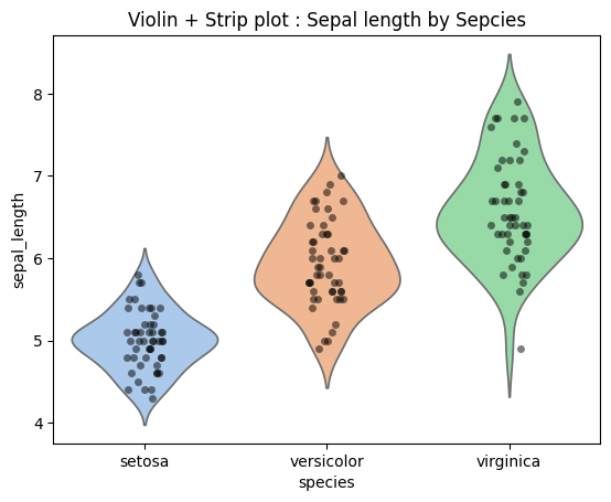 plt.title('Violin + Strip plot : Sepal length by Sepcies')