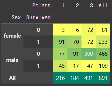 pd.crosstab([train.Sex, train.Survived], train.Pclass, margins=True).style.background_gradient(cmap='summer_r')