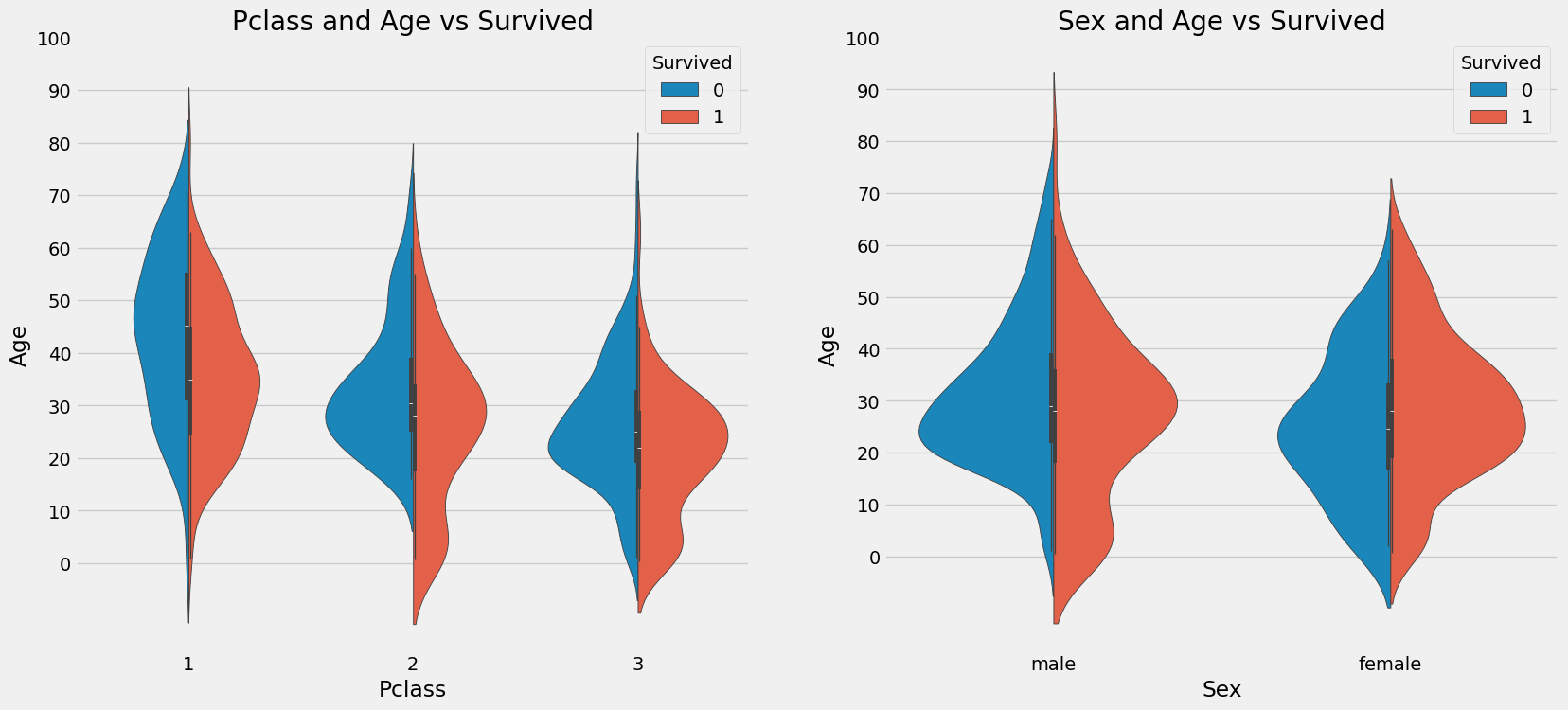 sns.violinplot(x='Sex', y='Age', hue='Survived', data=train, split=True, ax=ax[1])