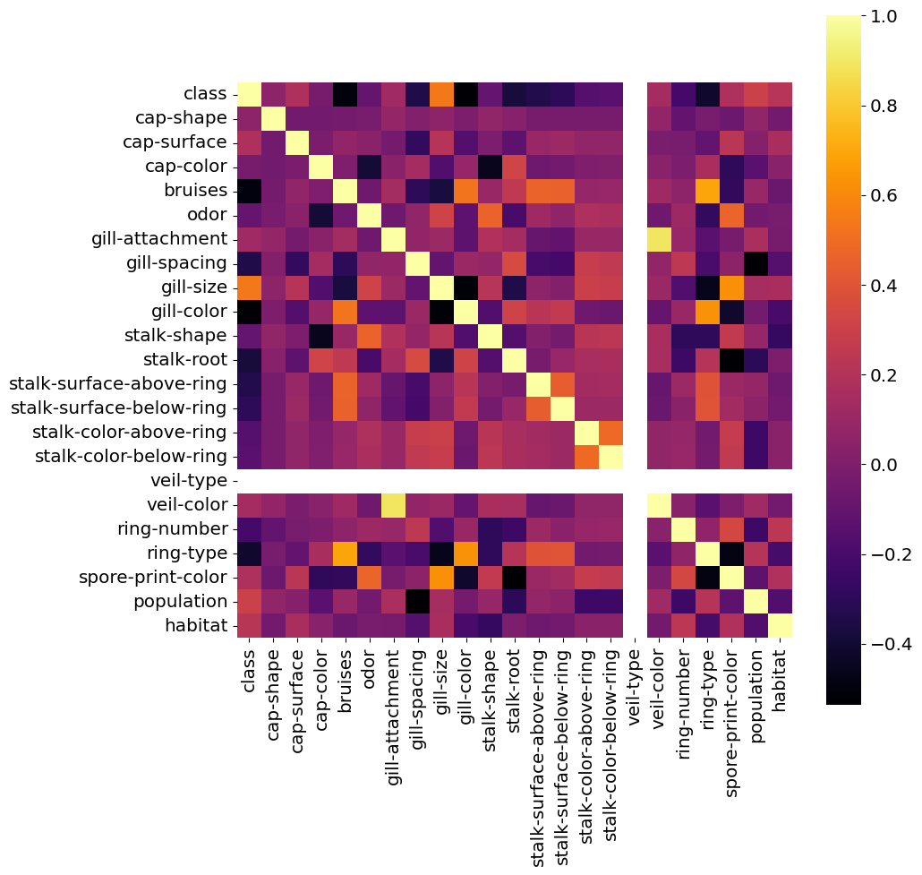 sns.heatmap(mush_encoded.corr(), cmap='inferno', square=True)