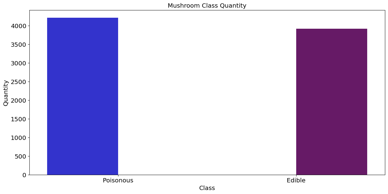 ax.set(title=f"Mushroom {col.title()} Quantity", xlabel=f"{col.title()}", ylabel="Quantity")