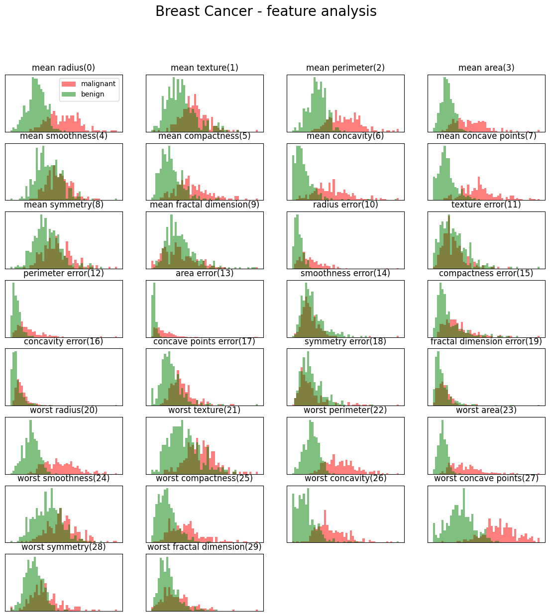 fig.suptitle('Breast Cancer - feature analysis', fontsize=20)