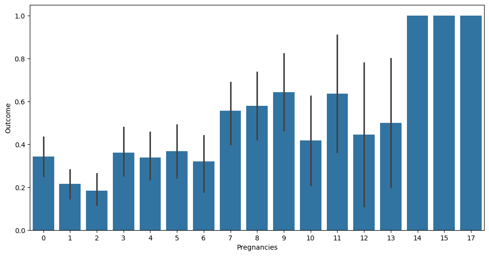 sns.barplot(x='Pregnancies', y='Outcome', data=diabetes_data)