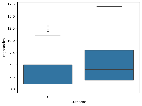 sns.boxplot(x='Outcome', y='Pregnancies', data=diabetes_data)