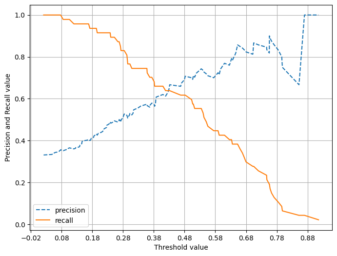 # X축을 threshold값으로, Y축은 정밀도, 재현율 값으로 각각 Plot 수행. 정밀도는 점선으로 표시
