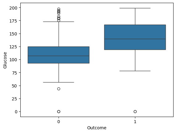 sns.boxplot(x='Outcome', y='Glucose', data=diabetes_data)