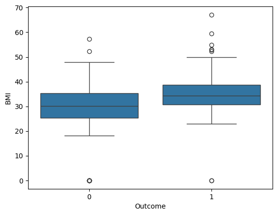 sns.boxplot(x='Outcome', y='BMI', data=diabetes_data)