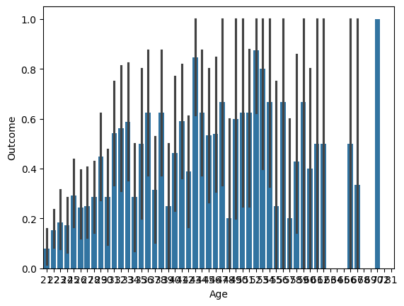 sns.barplot(x='Age', y='Outcome', data=diabetes_data)