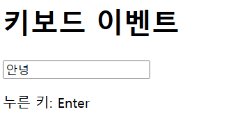 document.getElementById('output').textContent = `누른 키: ${event.key}`;