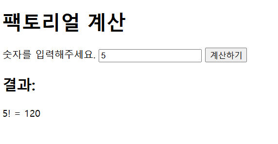 resultDiv.innerHTML = `${number}! = ${factorial}`; // 결과 출력
