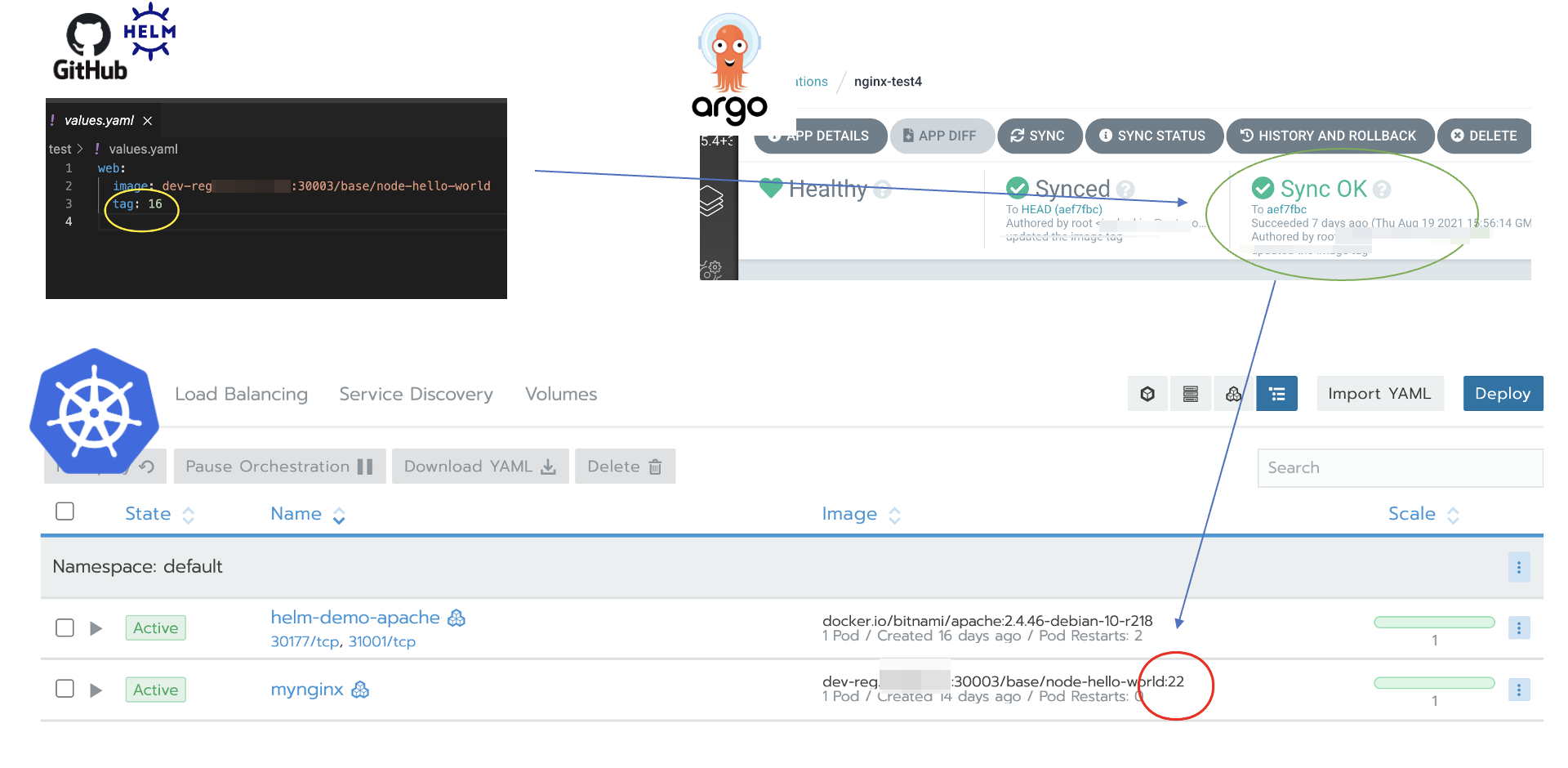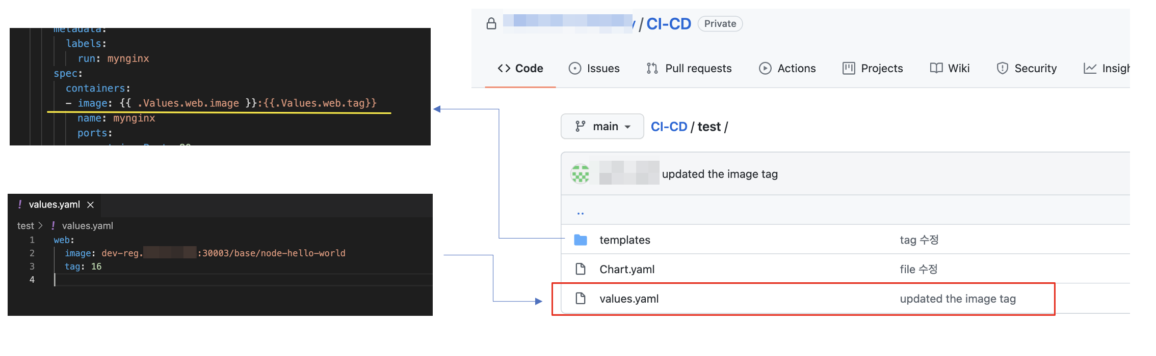 이제부터 k8s resource는 선언적 배포 방식으로 Argo CD에 의해 관리, 제어됩니다. Git 저장소의 코드 수정은 리소스를 변경하기 위해 사용되지만 초기 세팅 이후 업데이트할 일은 그리 많지 않을 겁니다. 다만 빈번히 발생되는 건 Deployment, Statefulset 등 manifest의 Container image tag 변경 입니다. helm-values에선 각 환경별 values.yaml에 image.tag 값으로 관리됩니다.