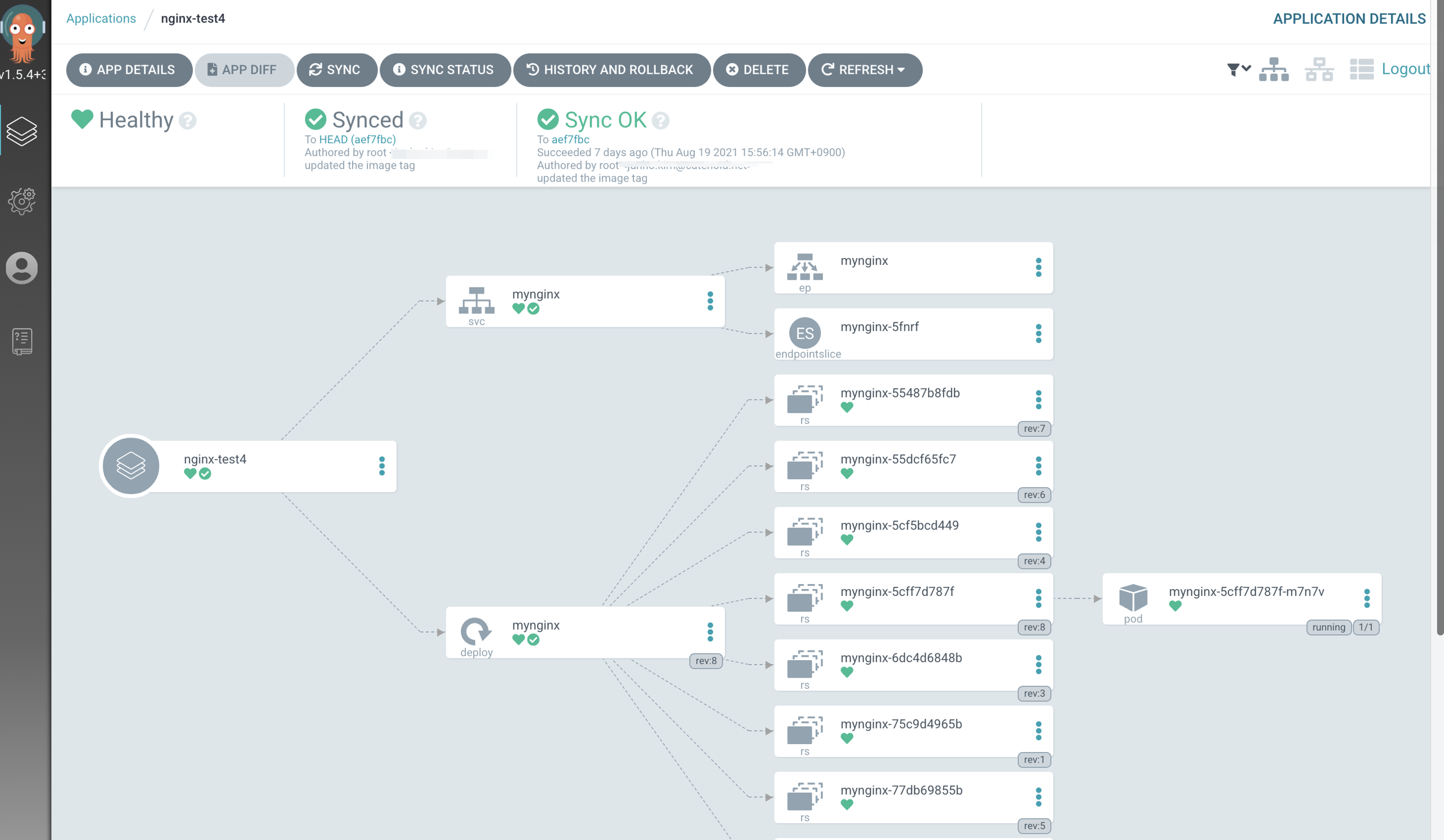 무엇보다 화면처럼 Argo application 별로 관리되는 k8s resource에 대한 시각화입니다. 위에서 언급된 것 처럼, 공용 Helm chart를 사용하여 사용자가 필요한 values.yaml만 지정하여 resource에 대해 원하는 배포 상황을 선언합니다. helm cli도 훌륭한 도구이지만 chart에 구성되는 resource를 한눈에 파악하기 어렵습니다. Argo CD에선 구성되는 Kubernetes resource를 파악하기 용이하며 Ingress - service - pod로 연결되는 selector 등 UI를 통해 확인하기 좋았습니다.