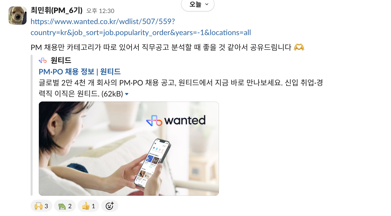 나도 채용 공고를 더 편하게 볼 방법이 없을까 고민하다가 이전에 자료조사할 때 이용했던 원티드가 PM 맞춤 채용 공고가 있다는 것을 발견하고 바아로 공유.