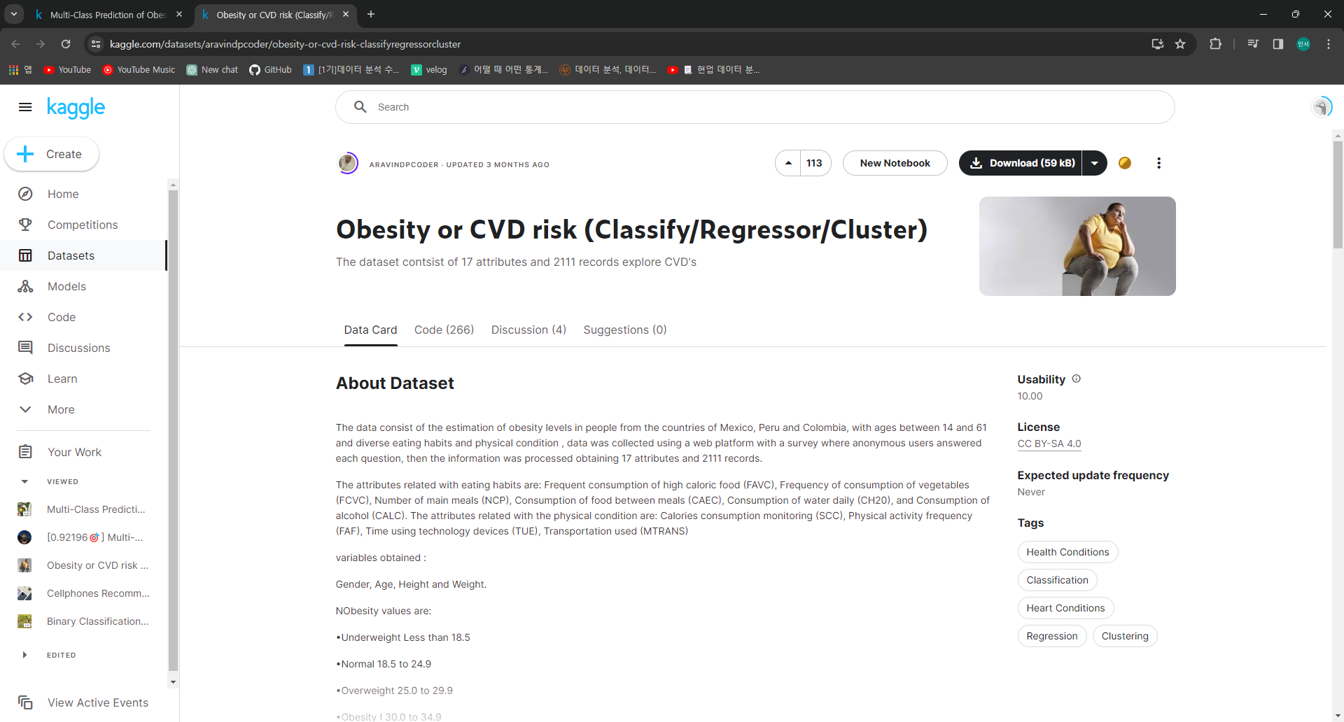 Obesity or CVD risk (Classify/Regressor/Cluster) 에서 데이터를 가져옴