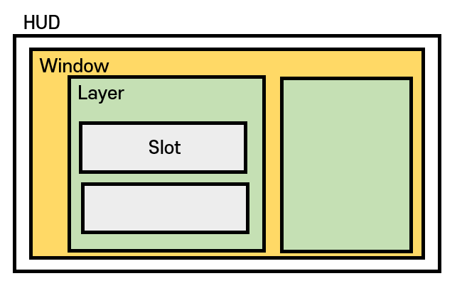 - HUD는 여러 UI 레이어를 포함하며, 그 안에서 Window,Layer, Slot이 계층적으로 동작한다.