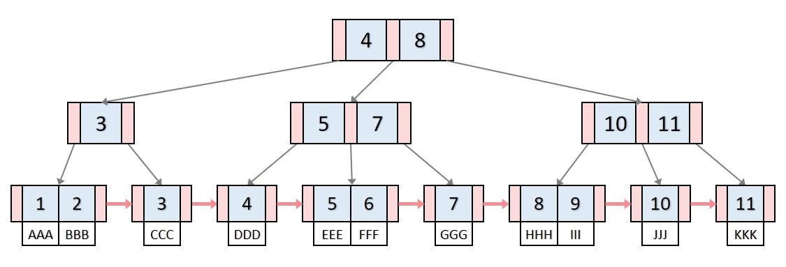 leaf 노드끼리 연결 리스트로 연결되어 있어서 범위 탐색에 매우 유리함