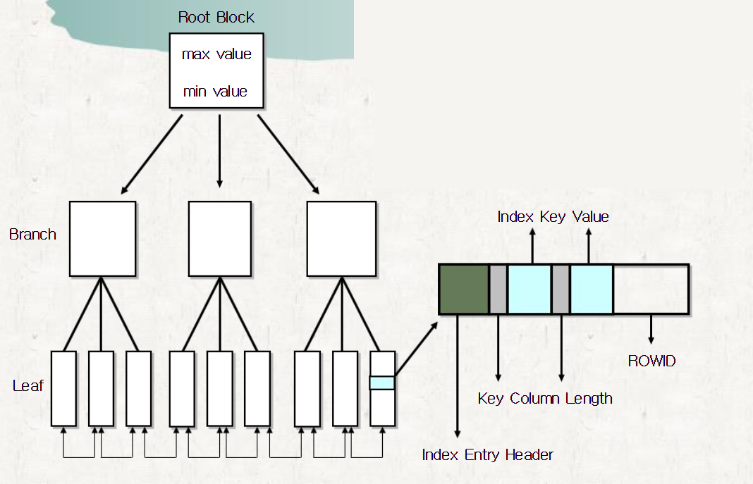 구조는 위와 같이 Root(기준) / Branch(중간) / Leaf(말단) Node로 구성되며 계층적 구조를 갖고 있다. 특정 컬럼에 인덱스를 생성하는 순간 컬럼의 값들을 정렬하는데, 오라클 서버에서 풀 스캔보다 인덱스 스캔이 유리하다고 판단되었을 때 생성된 인덱스의 정렬한 순서가 중간쯤 되는 데이터를 뿌리에 해당하는 ROOT 블록으로 지정하고 ROOT 블록을 기준으로 가지가 되는 BRANCH블록을 정의하며 마지막으로 잎에 해당하는 LEAF 블록에 인덱스의 키가 되는 데이터와 데이터의 물리적 주소 정보인 ROWID를 저장한다.