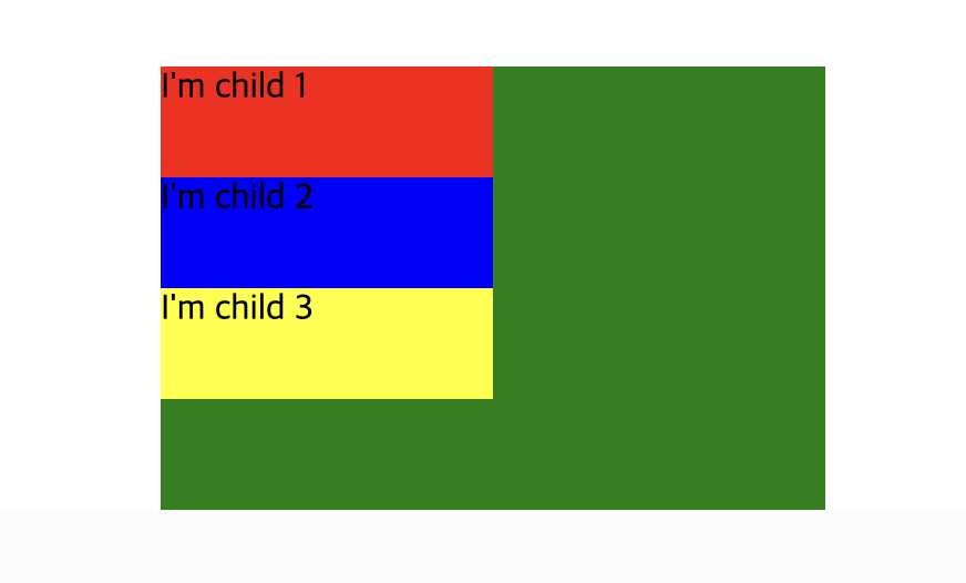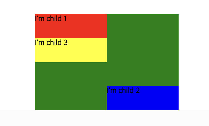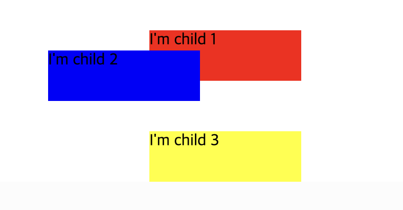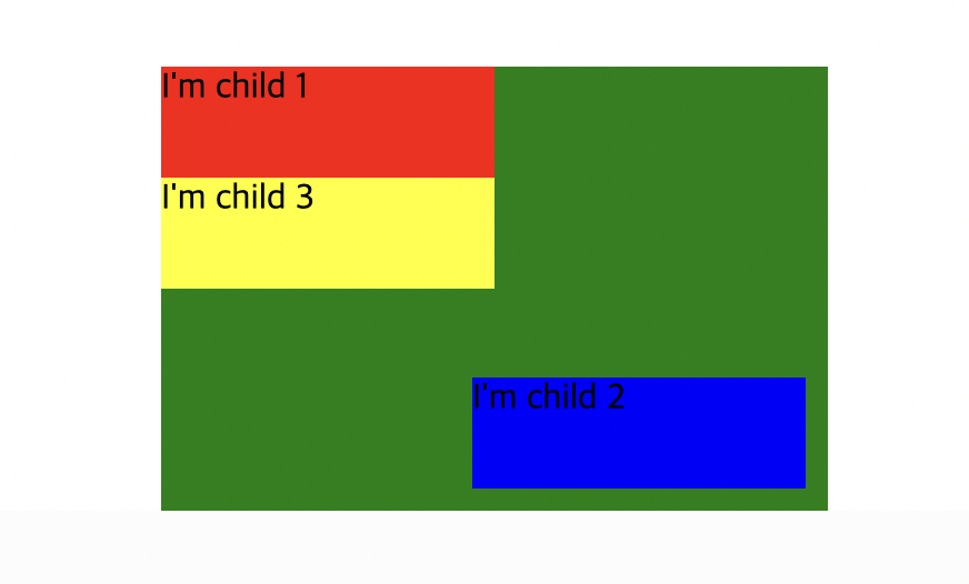 사실은 사라진 것이 아닙니다. 세 번째 아이는 두 번째 아이의 아래에 깔려서 안보이는 거에요. 왜냐하면, 두 번째 아이에게 absolute를 선언한 순간, 두 번째 아이는 이제 부모, 첫 번째, 세 번째 아이와는 전혀 다른 레이어에 존재하게 되었거든요. 두 번째 아이만 위로 똑 떨어져 나온 것이라고 생각하면 됩니다. 이제 두 번째 아이에게도 top, bottom, left, right 프로퍼티를 주고 어디로 이동하는지 볼까요?