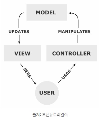 사용자가 controller를 조작하면 controller는 model을 통해서 데이터를 가져오고 그 정보를 바탕으로 시각적인 표현을 담당하는 View를 제어해서 사용자에게 전달한다.