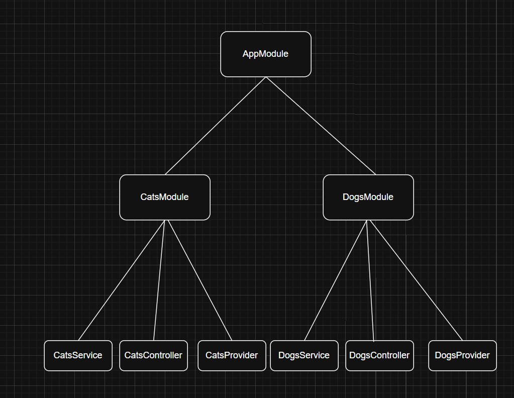 모듈화: 애플리케이션이 여러 개의 모듈로 나뉘며, 각 모듈은 관련된 컨트롤러, 서비스, 파이프, 미들웨어 등을 포함한다.