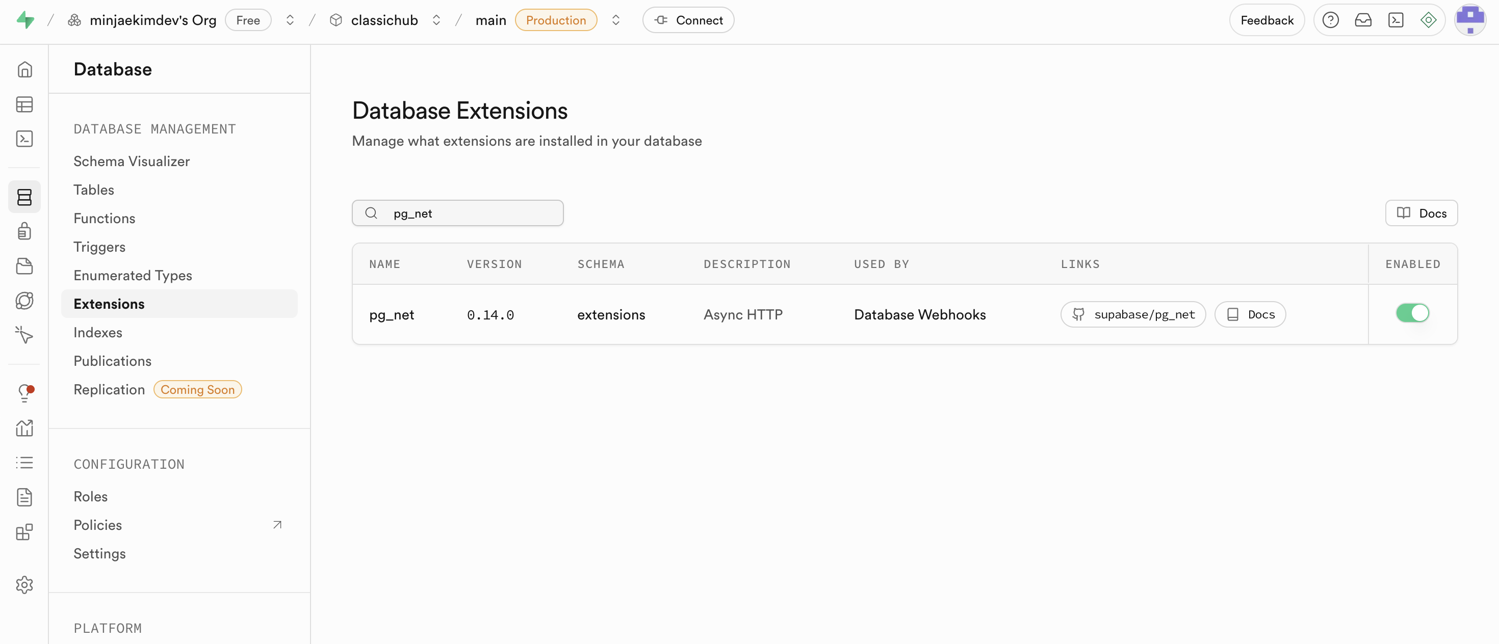 클라우드 Supabase > 내 프로젝트 > 왼쪽 사이드바 Database > Extension