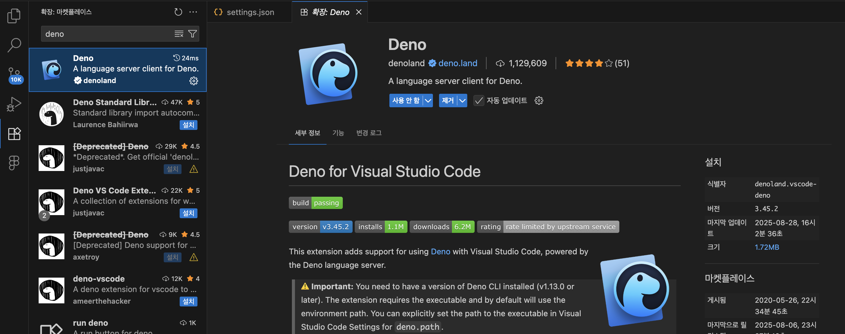 VS Code 기준으로, Extension에 deno를 검색하고 다음 확장을 설치하면 된다.