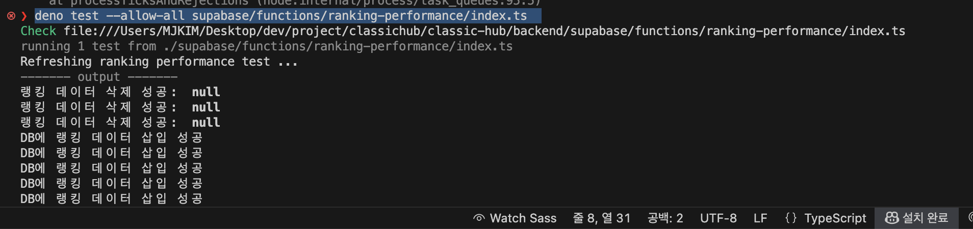 완료되면 다음 명령어를 통해 테스트한다. 명령어를 실행하기 위해서는 brew install deno