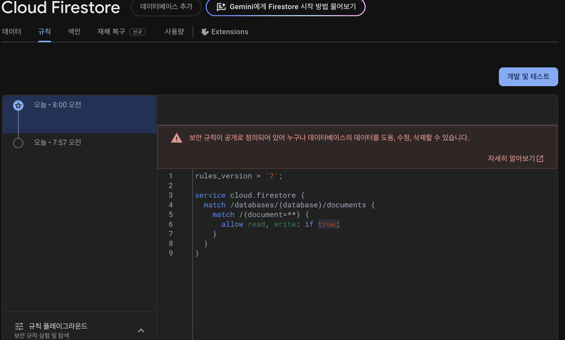 ์ค๋ฅธ์ชฝ ๋ฐ์ ์๋ firestore Database์ ๋ค์ด๊ฐ ๊ธฐ์ด ์ธํ