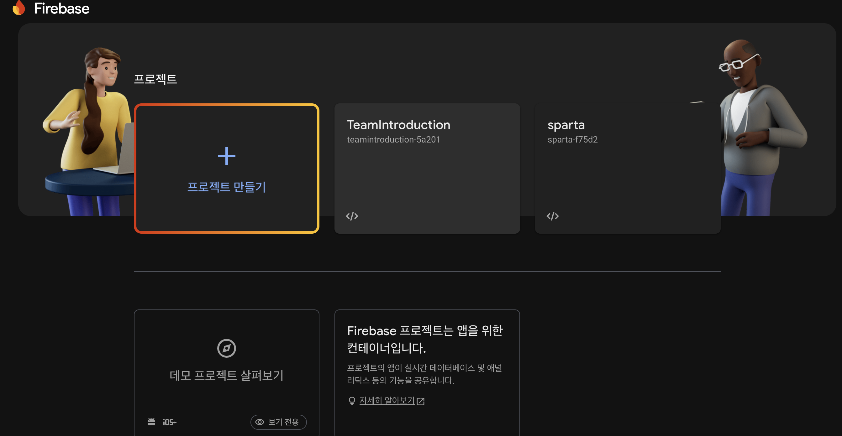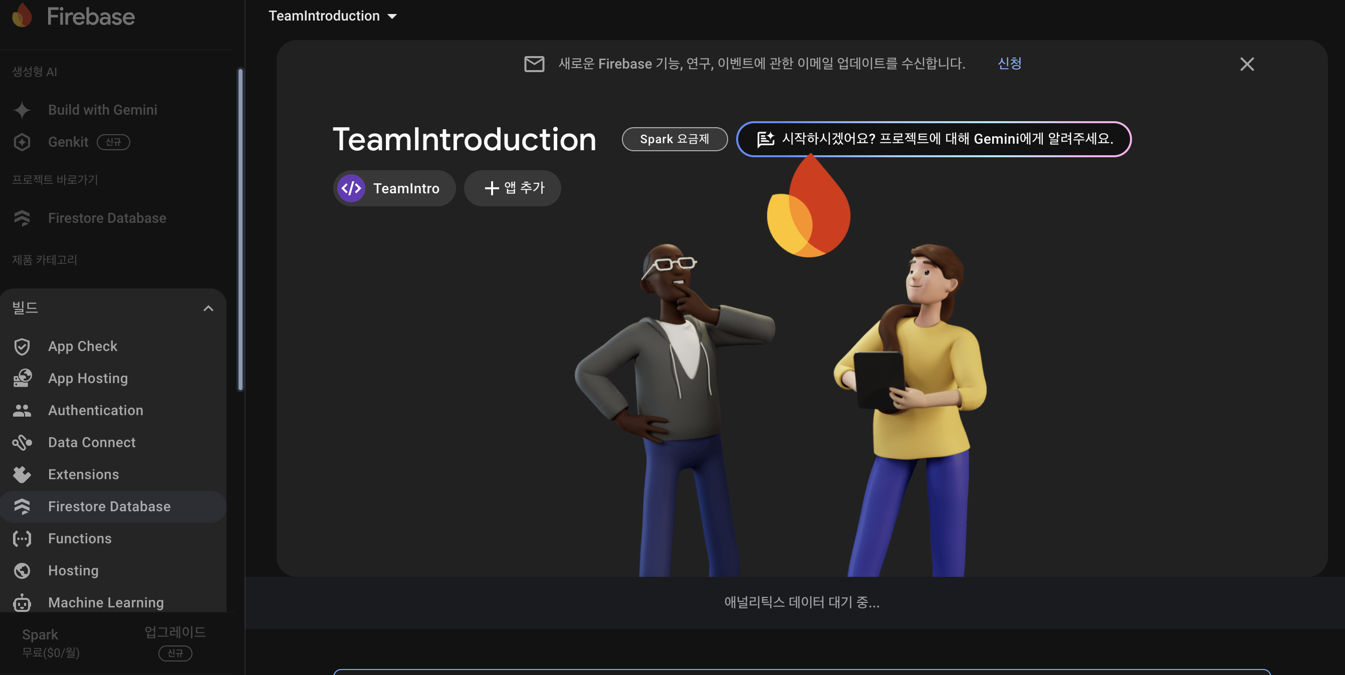 firebase ์ฝ์์์ ํ๋ก์ ํธ ๋ง๋ค๊ธฐ๋ฅผ ํด๋ฆญํด TeamIntroduction์ด๋ผ๋ ํ๋ก์ ํธ๋ฅผ ์์ฑํ๋ค.