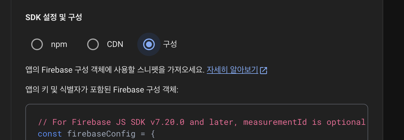 "Firebase ๊ตฌ์ฑ ์ ๋ณด ์ค์ " ์ฌ๊ธฐ์๋ค๊ฐ ์๊น ์ฐ๋ฆฌ์ Firestore์ ์๋ SDK ๊ตฌ์ฑ ์ฝ๋(api key ๋ค์ด์๋)๋ฅผ ๋ฃ์ด์ฃผ๋ฉด ๋๋ค!