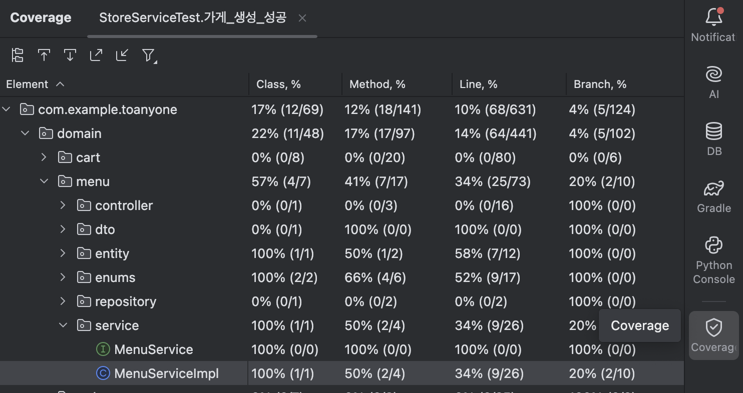 그리고 이렇게 커버리지가 몇퍼센트정도 진행됐는지 오른쪽의 커버리지탭에서 확인이 가능하다