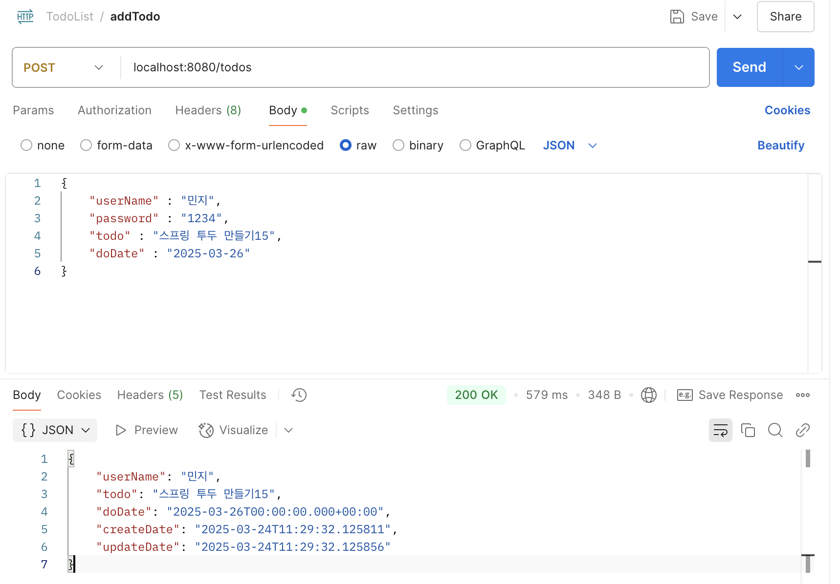 Todo todo = new Todo(dto.getUserName(), dto.getPassword(), dto.getTodo(), dto.getDoDate(), LocalDateTime.now(), LocalDateTime.now()); //투두 내역 받아서