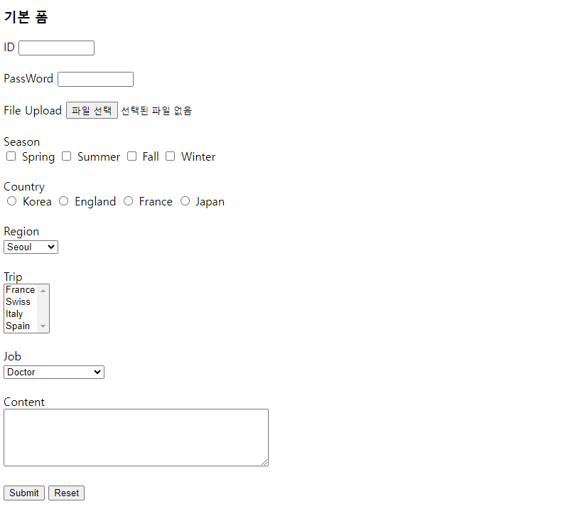 서버에 데잍르런송할때는 form 태그 안에 하위 태긒 input, select, textarea 등을 명시하고 태그에 데이터를 입력해서 전송함.